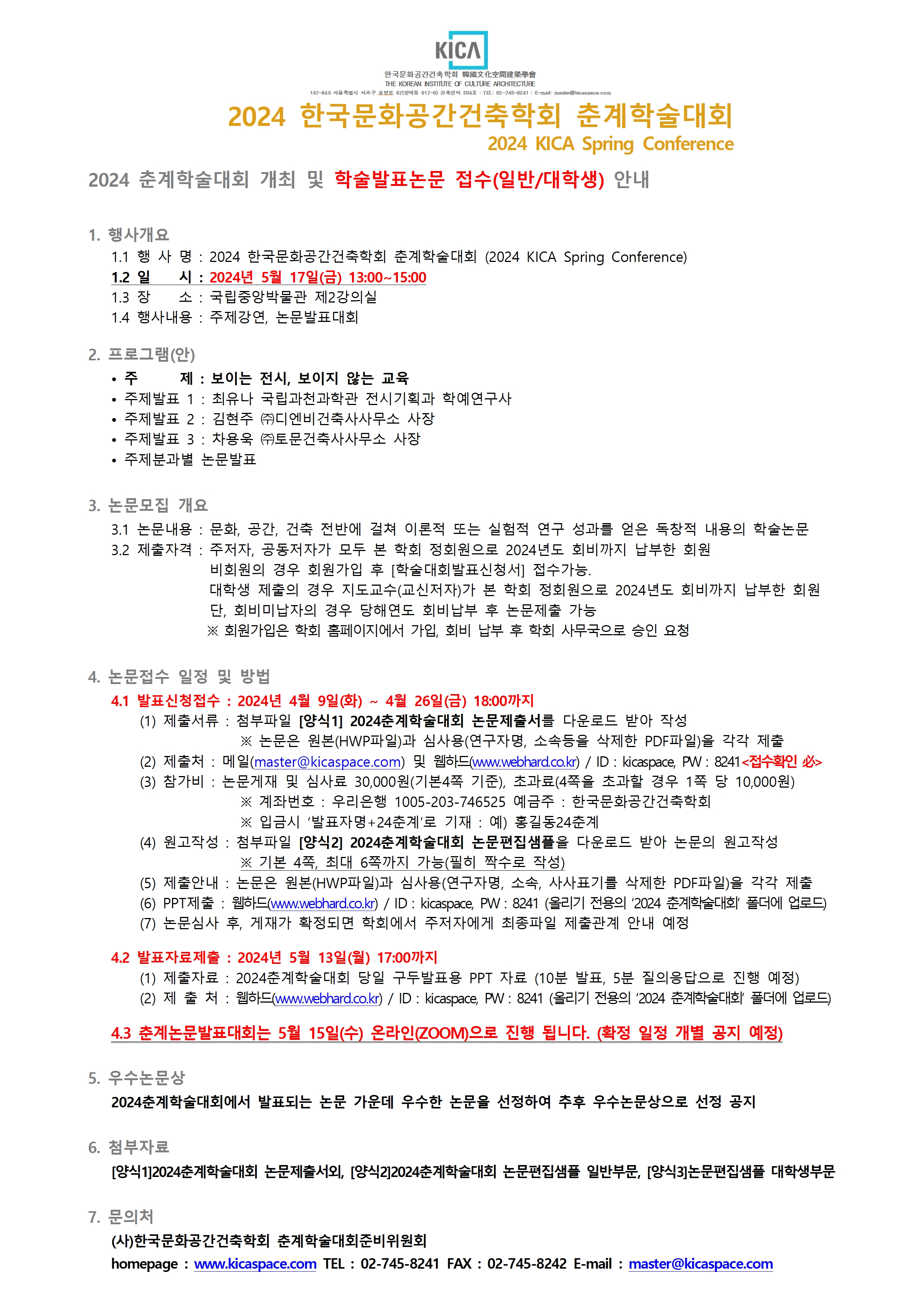 1.1 행 사 명 : 2024 한국문화공간건축학회 춘계학술대회 (2024 KICA Spring Conference)